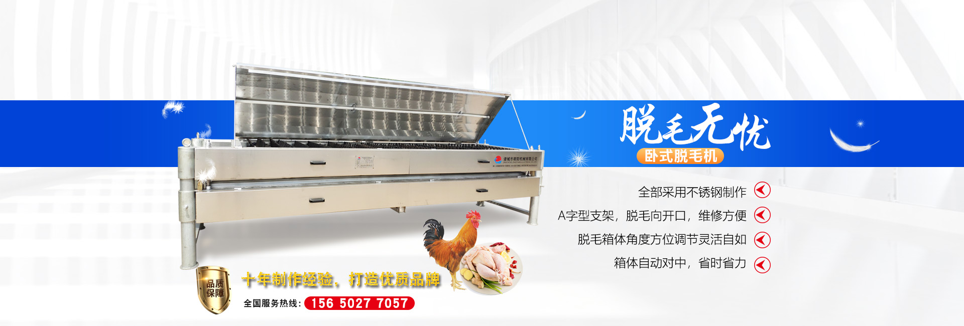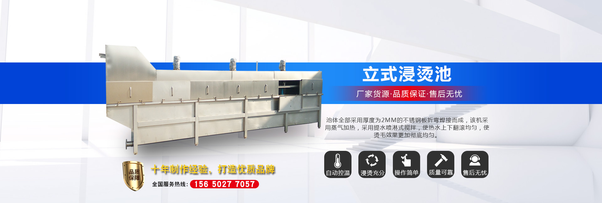 公司長期與國內(nèi)外屠宰加工企業(yè)合作,走引進(jìn)——消化——創(chuàng)新和自主研發(fā)相結(jié)合的道路,在國內(nèi)外同類產(chǎn)品的基礎(chǔ)上,不斷更新和改造。公司主要設(shè)備有:A字型立式脫毛機(jī)、臥式脫毛機(jī)、強(qiáng)力噴淋機(jī)、松毛機(jī)、浸燙池、螺旋預(yù)冷機(jī)、禽籠清洗機(jī)、電暈機(jī)、兔扯皮機(jī)、兔割前爪/后爪機(jī)、剝胗機(jī)、自動洗鉤機(jī)、螺旋燙爪機(jī)、雞爪脫皮機(jī)、分割輸送帶等屠宰用設(shè)備。其中,公司獨(dú)力發(fā)明生產(chǎn)設(shè)計(jì)的“電動調(diào)節(jié)脫毛機(jī)”及“自動控水控溫浸燙池”順利通過知識產(chǎn)權(quán)局的實(shí)質(zhì)性審查。公司所生產(chǎn)的設(shè)備 可與國外同類產(chǎn)品配套使用,設(shè)備遠(yuǎn)銷阿爾及利亞、澳大利亞等中東、非州等并建立了長期穩(wěn)定的合作關(guān)系。